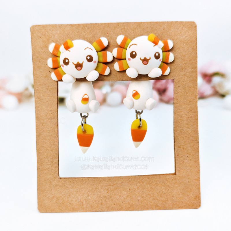 Cute design inspired by an adorable candy corn axolotl typical of the Halloween Party in the United States. This axolotl is inspired by Halloween and is simulating piercing the ear (false dilation). The ear hook is made of stainless steel.