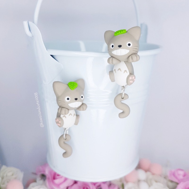 Ghibli-inspired earrings with kittens that pretend to be hanging from your ear, inspired by a cute fusion design between Totoro and Catbus. Perfect gift for lovers of cats and Ghibli movies.