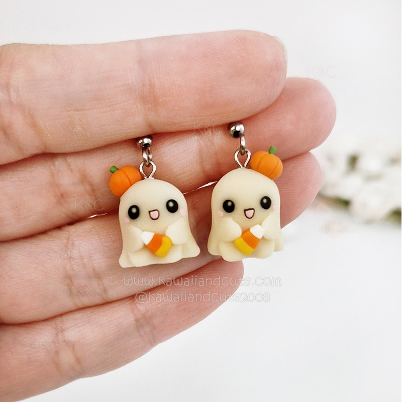 Adorables pendientes de fantasmitas kawaii con dulces para Halloween